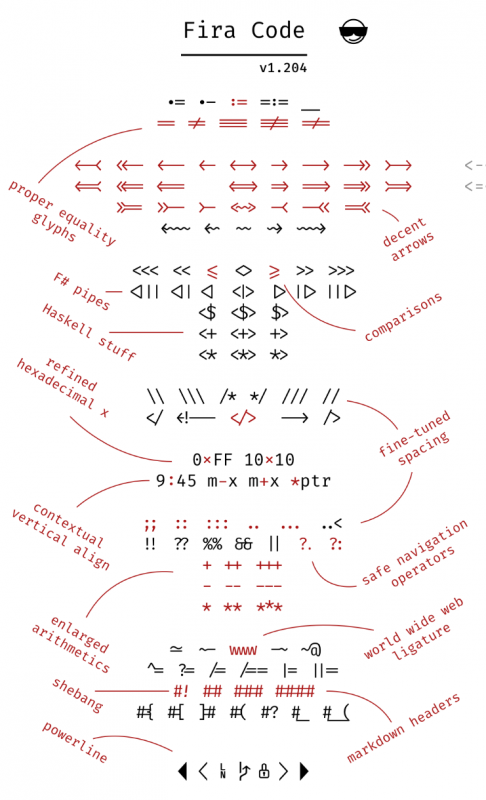 О остановился на Fira Code. Начертание не привычное, оно отличается от того шрифта, что используется в st3 по умолчанию. Но в целом очень даже ничего. Вот его рекламная брошюрка: